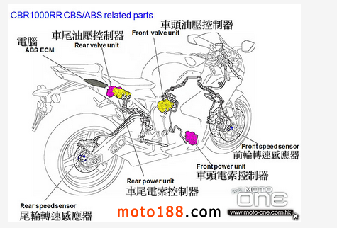 ●更仔細地顯示HONDA C-ABS全套煞車系統(tǒng),著車后車速超過6km/h及扣下煞車桿后,迫力的油壓由ECU行車電腦掌管,因此可稱為電子制動。