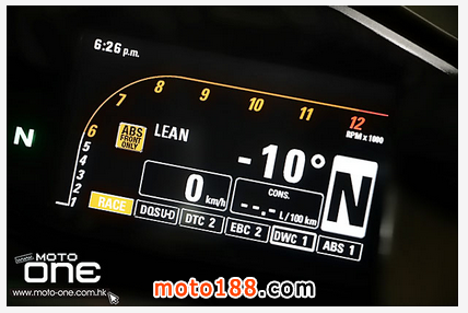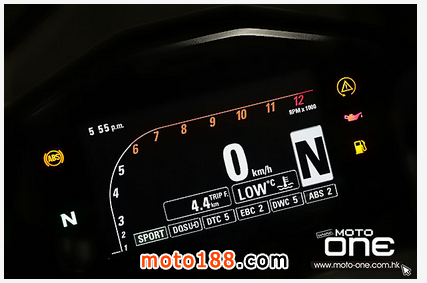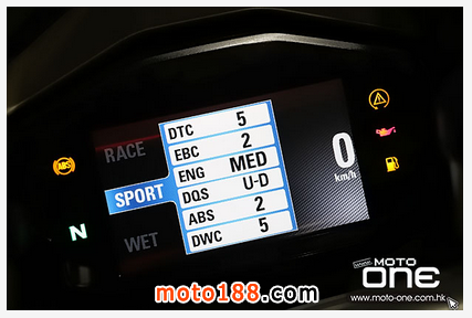 ●彩色屏幕顯示了選用的輔助系統(tǒng),例如快速電子轉(zhuǎn)檔(DQS)、循跡系統(tǒng)(DTC)、引擎煞車(EBC),防起頭(DWC)及ABS防鎖死煞車系統(tǒng)等等。