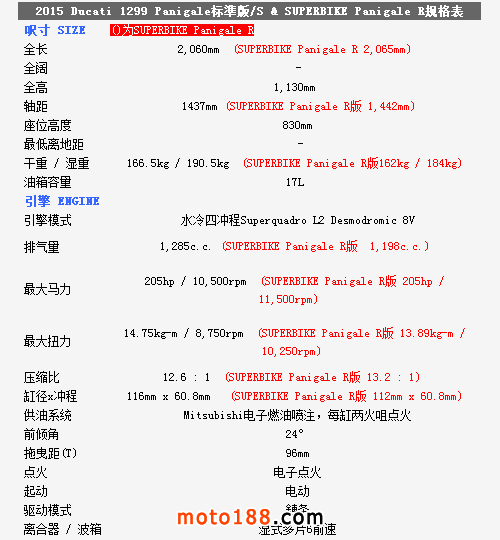 DUCATI推出1299后,為節(jié)省成本,便停止了1199的生產(chǎn)線,因此讀者在 DUCATI官方網(wǎng)站上只找到1299 Panigale、1299 Panigale S及Panigale R的資料。但DUCATI為了保持參加WSBK資格,因此維持Panigale R的生產(chǎn),其排氣量只有1,198cc,仍屬1199系列,而此車上一代已在2013年推出市場,今次介紹的2015版在性能上卻經(jīng)過大幅改良。另外 WSBK賽會(huì)除了設(shè)定排氣上限外,還有規(guī)定車廠必須生產(chǎn)一定數(shù)量的對(duì)應(yīng)市販車出售,可是受到經(jīng)濟(jì)下滑影響,為了降低參賽門檻,生產(chǎn)數(shù)量由過去的2000臺(tái) 縮減至現(xiàn)在的125臺(tái),第二年參賽則提升至最少1000臺(tái),但這數(shù)字怎會(huì)難到經(jīng)驗(yàn)豐富的DUCATI呢!