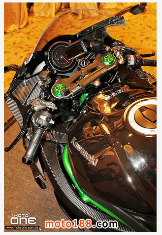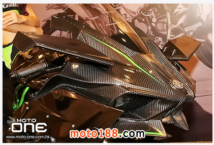 H2R采用噴上川崎綠的鋼管車架,而非采用日本跑車慣用的鋁合金車架,再者配合單尾擔設計,極富意大利車風格,配上機械增壓的直列四汽缸998cc引擎,馬力輸出310匹馬力。由于引擎使用了機械增壓關系,車頭入風口連接兩條全碳纖制造的導管把鮮風引進機械增壓內,壓縮空氣然后再經由火辣辣紅色導管傳進風鼓內。當碳纖包圍披回車輛后,視覺上讓碳纖導風管成為包圍一部份。另外4出1的原裝排氣管像是鈦合金制,并富有改裝排氣管的風味,欣賞車輛的結構,車身細節(jié)擁有緊湊及壓迫布局,全身長滿沒有脂肪的肌肉。