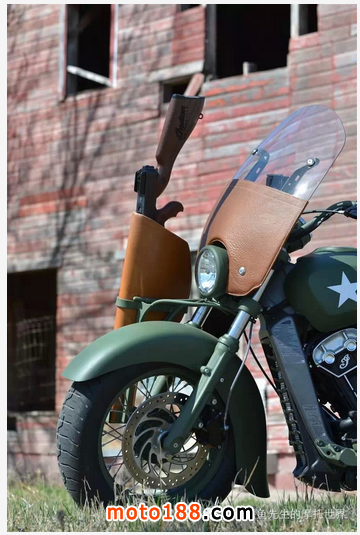 這款定制車是出自南達(dá)科他州米切爾市的著名定制廠商Klock Werks Kustom Cycles之手。這款車基于2015款印第安Scout打造,整車采用了老式軍用摩托車的啞光綠噴涂,尾燈采用了定制支架模仿原版軍用摩托車的風(fēng)格,裝備了皮質(zhì)邊包,風(fēng)擋玻璃下半部也采用皮質(zhì)覆蓋。