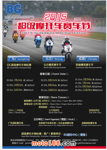 北京:2015年,BG亦與北京友昵客汽車俱樂部/北京金港賽車場再次合作,在北京的北方精英賽車節(jié)里,舉辦3站超級摩托車錦標賽事。