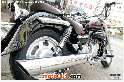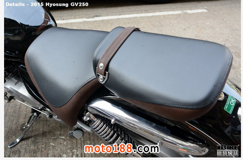 風(fēng)油冷GV250雖然是排氣量249cc,它的外形毫不輸蝕。肥厚的頭尾輪沙板、正立前叉包有電鍍套筒和大油缸,論賣相和體積都可以媲美 Honda Magna 250。GV250的駕駛姿勢似街車多於美式巡航車,雙腳最為彎曲,雙臂也不用張開,好處是操控較靈活。176kg車重和710mm座高也是相當(dāng)容易處理的數(shù)字。