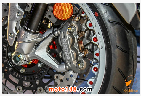 前叉為43mm Marzocchi 倒立式前叉,并採用紅色陽極處理,吸睛效果一流
