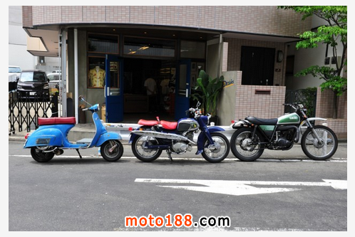 剛到日本的興奮心情已經(jīng)過去,開始適應(yīng)了日本的時差和街道,徒步成了我的主要交通方式,也正是因為這個原因我才在街頭遇到了這三輛漂亮的復(fù)古摩托。不過需要大家原諒我的是,對于上個世紀(jì)六七十年代的摩托我真的了解甚少,如果讀者知道,可以來做個詳細的介紹。左邊這臺Vespa真的是一臺非常經(jīng)典的車型,單獨來看這一臺車,其成色也是相當(dāng)不錯的,但如果對比一下右邊這兩臺本田Dream和雅馬哈(不確定型號),Vespa就顯得有些老舊了,有句話叫“車比車,氣死車”。