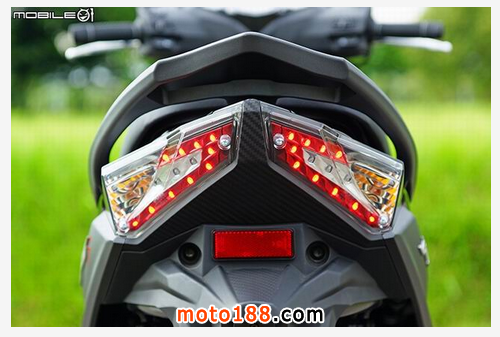 車(chē)尾采用大面積的分離式尾燈組,中央更使用類(lèi)似碳纖維花紋的車(chē)殼增加質(zhì)感,尾燈采用單邊 10 顆 共 20 顆的 LED 發(fā)光二極管,并且于中央銀色區(qū)域做明顯的煞車(chē)燈分隔,煞車(chē)時(shí)除了會(huì)亮起單邊三顆共六顆的發(fā)光二極管外,做為尾燈的 20顆發(fā)光二極管也會(huì)一并加強(qiáng)亮度,借此提升安全性。