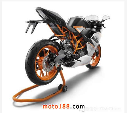 RC390 的編織式鋼管車架以Duke車架為基,但增加了后傾角,縮短了軸距和增加了離地距,令RC390的操控更敏銳,轉(zhuǎn)向極限更高。鋁合金尾搖臂和WP單筒尾避震都是高規(guī)格貨色,有極佳的抗扭性能和循跡表現(xiàn),有助提升操控。