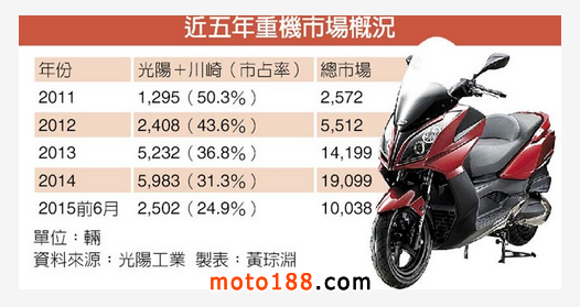 核心提示: 近五年重機市場概況 大型重機市場起飛,臺灣機車業(yè)龍頭光陽工業(yè)與日本川崎(KAWASAKI)重工業(yè)攜手合攻臺灣市場,光陽首度為