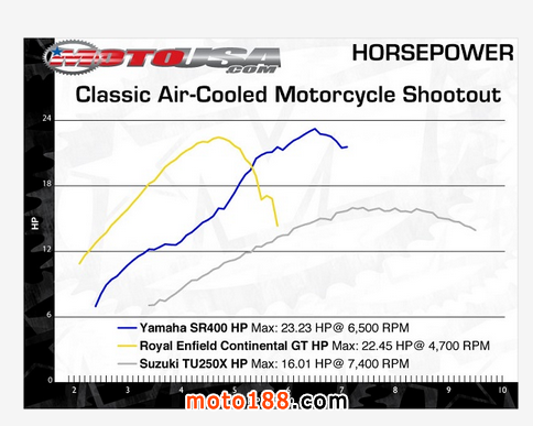 功率測(cè)試中,雖然皇家恩菲爾德的排量最大,但功率卻不是最大的,雅馬哈以微弱的優(yōu)勢(shì)領(lǐng)先。