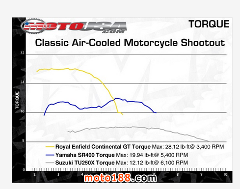 排量?jī)?yōu)勢(shì)完全體現(xiàn)在了車(chē)子的扭矩上,皇家恩菲爾德以最大扭矩38.12N.m的優(yōu)勢(shì)遙遙領(lǐng)先,比鈴木TU250X的扭矩的兩倍還多。