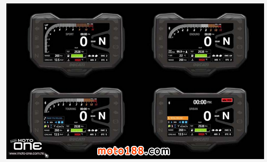 以傾角照明大燈為例,當(dāng)行車電腦感應(yīng)車身傾則入彎時(shí)便啟動(dòng)車頭的LED燈,照明黑暗的彎角,提高行車視野,這功能類似四輪上的照明系統(tǒng)。而Cornering ABS同樣是根據(jù)車身轉(zhuǎn)向角度電腦不斷地進(jìn)行調(diào)校,可避免騎士在攻彎時(shí)過(guò)度扣下掣動(dòng)桿,導(dǎo)到失去慣性轉(zhuǎn)向力引致Lowside意外。除此之外,今代車輛還有Ducati Wheelie Control (DWC)8段調(diào)校的防起頭功能,而高速公路定速巡航按鈕可讓車輛自動(dòng)行駛,還有今代車輛采用無(wú)匙啟動(dòng)車輛,并可遙遠(yuǎn)控制打開座椅。另外,車輛還加入多媒體功能Ducati Multimedia System (DMS),透過(guò)籃芽連接手機(jī)後(適合Android及IOS使用),彩色儀表成為多媒體屏幕,可聽歌、接收朋友訊息及接聽電話等等,DUCATI還特設(shè)網(wǎng)站,讓騎士分享行車資訊如行駛路線等等。