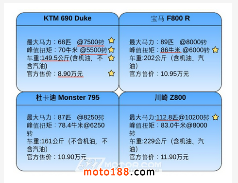 690 Duke這車怎么樣?不妨與寶馬F800 R、杜卡迪Monster 795、川崎Z800等國內(nèi)同級別車型從數(shù)據(jù)上對比來看: