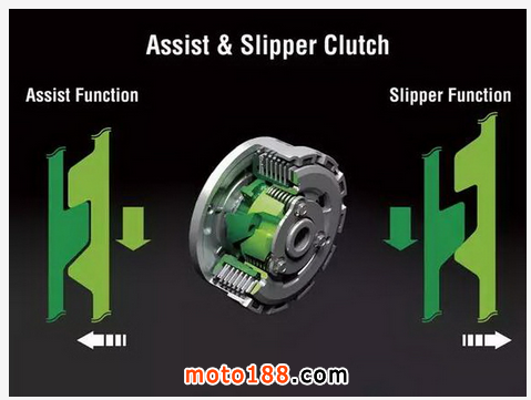 標(biāo)準(zhǔn)化裝配有從賽車界誕生的輔助功能和滑動(dòng)式離合器。在離合器中央和壓力板的嵌合部分提供了輔助凸輪和滑動(dòng)凸輪這兩種凸輪,是一種過去沒有的具有兩種新功能的新的離合器。 通常在引擎轉(zhuǎn)動(dòng)時(shí),輔助凸輪帶來的自我支持效果可以調(diào)節(jié)離合板的接合。由此可以減輕對(duì)離合器桿的操作力。此外急減速或者過度引擎制動(dòng)時(shí),滑動(dòng)技能開始生效。滑動(dòng)式凸輪減弱離合板的接合,避免反向轉(zhuǎn)矩,減低了后輪的調(diào)頻及打滑概率。