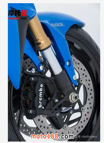 310mm的前剎車碟與GSX-R1000相同的鮑魚(yú)卡鉗使得你輕捏剎車就有足夠的制動(dòng)力,而ABS的加入只增重1.4磅而已