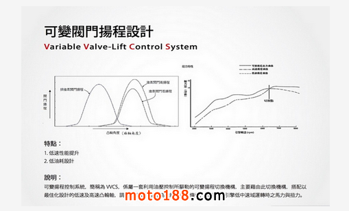 光陽利用油壓驅(qū)動高低兩組不同揚程的凸輪, 來改變引擎的進氣量