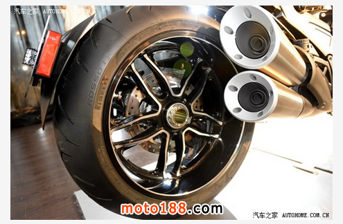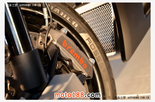 前后輪圈采用的是雙五輻式鋁合金鍛造輪圈,前后輪圈均為17×3.5J和17×8J,與之搭配的是倍耐力Diablo Rosso II系列輪胎,前后輪胎規(guī)格分別為120/70 ZR17和240/45 ZR17。而在制動系統(tǒng)方面,這款限量版車型依然采用由Brembo提供的四活塞制動系統(tǒng),前制動器為雙剎車盤設(shè)計,直徑為320mm。