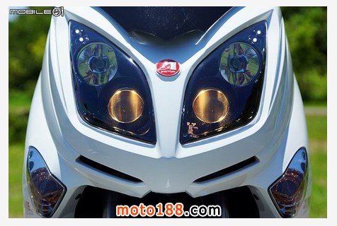 一樣從車頭開始看起,這次 Elite 300E 采用燻黑雙大燈組,大燈為遠(yuǎn)近燈獨立燈組,上方則是法國 ERMAX 的長風(fēng)鏡,對于高速風(fēng)壓阻擋有實質(zhì)加分效果,而在車頭斜角處則是方向燈組。