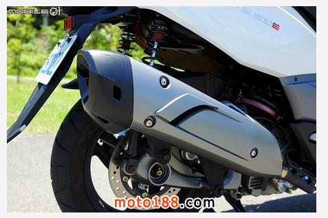 引擎的右側(cè)部分,這邊與 Elite 300i 差異不大,也是配置超長的排氣管前段與尾段,另外也可以看到 Elite 300E 的后碟盤之大。