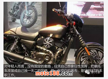 在我看來,玩風格,是STREET的唯一出路,雖然它的機動性能是哈雷家族中的優(yōu)等生,但還是和本田、杜卡迪等高手差了不少。比格調(diào),這可是歐日對手無法企及的,如圖高瑾馨女士所說,這張空白的畫布具備無限的創(chuàng)作空間,油畫還是漫畫,比的是精神層面的東西,哈雷品牌的魅力,是遠超過一部摩托車本身的。