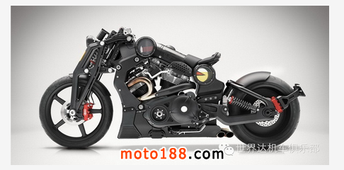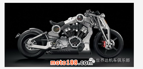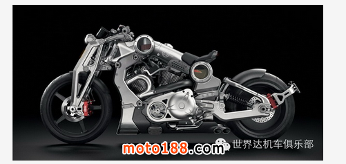 該車采用一副風(fēng)冷(帶油冷裝置)V 型 56 度雙汽缸的發(fā)動機,排汽量 132 立方英寸(2,163 cc),最大馬力輸出達(dá)到 200 匹。發(fā)動機與整個車身的主體材料是以美標(biāo) 6061 航空鋁、再以 CNC 數(shù)控加工制作而成,外觀造型采用了一個極為激進(jìn)的裸露金屬肌肉設(shè)計,以小量的碳纖組件作為襯托,而讓人過目不忘的還有那巨大的 240/45ZR-17 后輪胎。