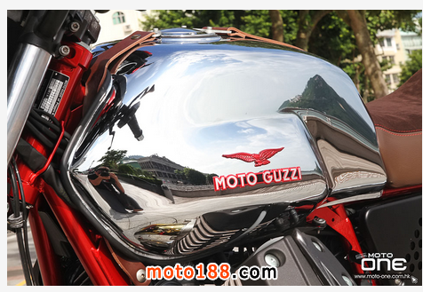 ●電鍍油缸上面配置精緻烙而有MOTO GUZZ 字款的皮帶。