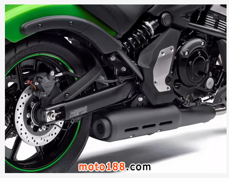 VULCAN S的底盤設置,同樣反叛了美式巡航的傳統(tǒng),放棄了鋼管搖籃式車架,改為采用VERSYS 650的結構,在用高拉力鋼管和鋁合金側板緊緊擁抱直列雙缸的同時,還用鋼管從氣缸兩側圍住發(fā)動機,顯得異常緊湊。采取接近水平右側安裝的單筒減震器,同樣借鑒了VERSYS 650的結構,行程為80 mm,彈簧預載7階可調;前叉則是41mm正立式前叉,提供130mm的行程。此外,排氣系統(tǒng)也與傳統(tǒng)巡航車不一樣,采用了短湊直管,并且安裝在發(fā)動機之下,此舉有利于降低整車重心,提高質量集中化程度。