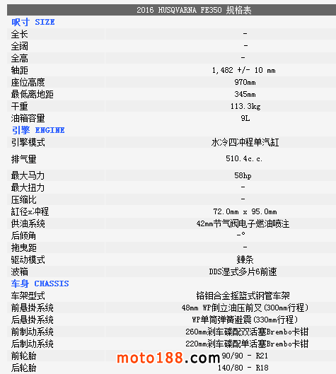 其實(shí)有留心HUSQVARNA Enduro系列的讀者,應(yīng)可看出系列的FE250、FE350、FE501等車系的主要設(shè)計(jì)大致相同,如鉻鉬合 金搖籃式鋼管車架、48mm WP 4CS全調(diào)校式倒立油壓前叉(300mm行程)、WP單筒彈簧避震(330mm行程)及(前)260mm、(后)220mm剎車碟。分別在于引擎容量的分 野,正如今次的主角2016 HUSQVARNA FE501,較其同系的FE250、FE350比,是追求更大馬力、扭力的用家愛好者吧﹗