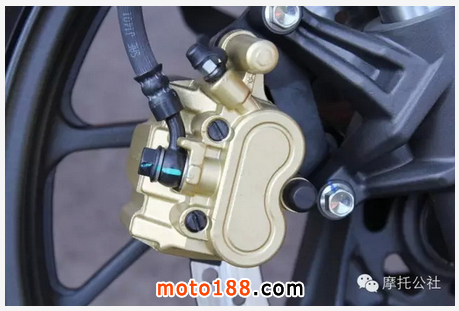 190R的剎車泵為日系標(biāo)配日清品牌,也一樣的土豪金色。前單碟雙活塞,后單碟單活塞的配置是基本的150級(jí)別配置,相信對(duì)于190R也足夠了。