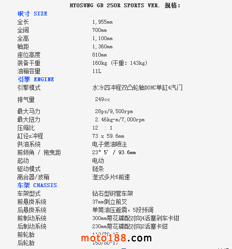 今年初登隆香港的HYOSUNG GD250R,主攻入門級大包圍市場,經(jīng)濟(jì)的車價成為賣點(diǎn)之一。HYOSUNG GD250R配置水冷四沖程雙凸輪軸DOHC單缸4汽門引擎,排氣量是249cc,馬力輸出28ps,採用電子燃油噴注供油。車身其它裝備也不失禮,例如採用37mm倒立前叉,提供5段預(yù)調(diào)的側(cè)置式尾避震(一般採用中置式),讓車輛看起來較特別,還有經(jīng)過設(shè)計的尾擔(dān)及液晶體儀表板等等,可看到設(shè)計師花了不少心思。