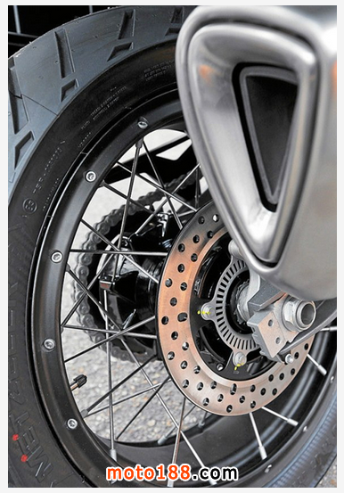 外觀上來(lái)看,19寸的帶輻條前輪使整車(chē)外觀上看起來(lái)更加的結(jié)實(shí)。