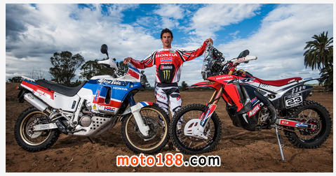 ●前是新款2016 HONDA CRF1000L Africa Twin,后是現(xiàn)役HONDA達(dá)卡戰(zhàn)車。