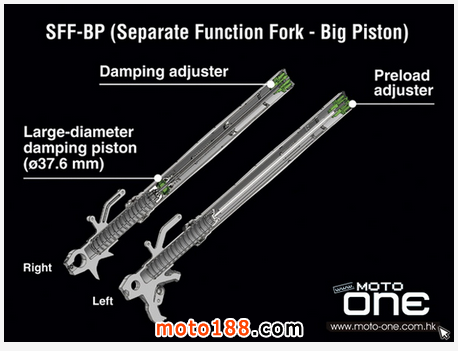 自上一代ZX-6R已開始使用Showa Big Piston Fork(BPF),但新款636是首臺配備Showa BPF及SFF前避震的市販車。此避震比傳統(tǒng)前叉大接近2倍的活塞,輪胎輾過各種凸凹路面時,避震油通過油路更具彈性,使前叉管下壓及回彈更暢順。而 SFF全名是Separate Function front Fork,結(jié)構(gòu)是左叉管行純油壓,右叉管使用傳統(tǒng)的彈簧及油壓,即現(xiàn)在所講的非常流行可左右獨立調(diào)校的高性能前叉。