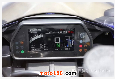 制動(dòng)則沒有延用R1 新的雙子星卡鉗,而是與MT-09 同樣的對四雙子星卡鉗搭配320mm 雙碟,當(dāng)然因應(yīng)歐盟法規(guī),ABS 也是標(biāo)準(zhǔn)配備。另外也搭載類似R1 的大型液晶儀表,能顯示包括轉(zhuǎn)速、時(shí)速、油表、里程、文件位等訊息,做為熱血車款,同樣具備換檔指示燈,并可因車主需要設(shè)定閃爍的轉(zhuǎn)速。