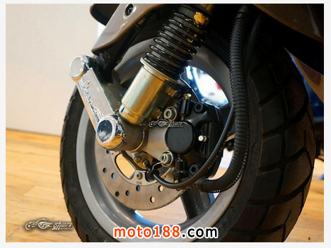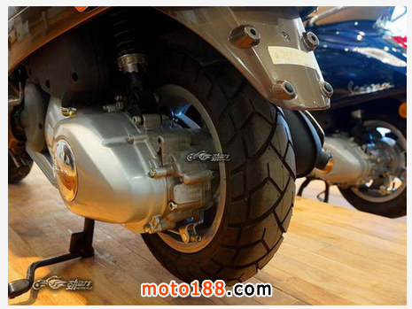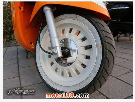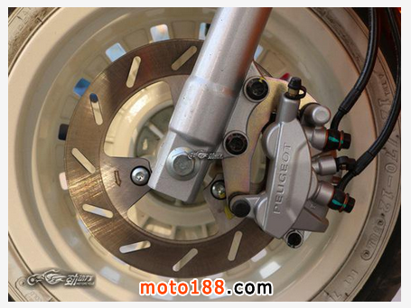 相比LX150的懸掛設計,“姜戈”的正立式前叉就顯得很普通了。不過,標致在車輪上花了心思,休閑版白色的輪輞,電鍍的輪轂罩,再配上白邊胎,營造出濃郁的復古風情。