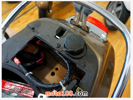 “姜戈”也有放置隨身物品的儲物格,其中也配有12V點煙器接口,并可以通過鑰匙在點火開關位置鎖閉。里面的小隔斷是專門為了放置手機的,顯得非常貼心,只是它的空間要比LX150的小了很多。