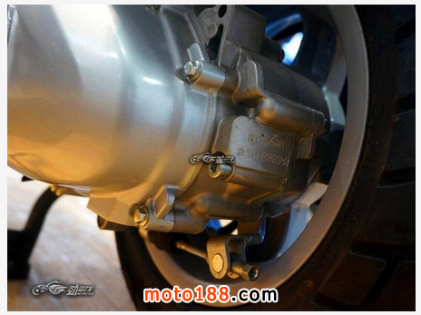 單鉆孔盤配合對向雙活塞卡鉗,對于這樣一輛150毫升排量的小踏板來說,已是綽綽有余了。