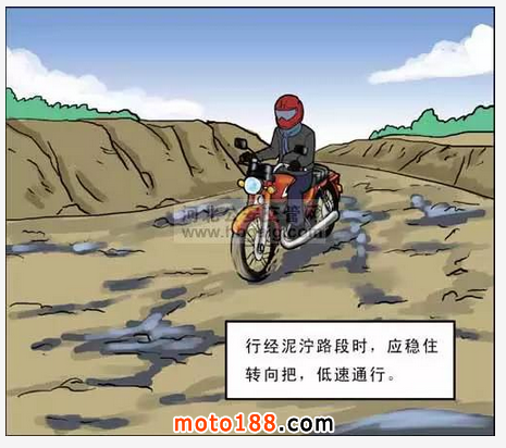(6)行經(jīng)泥濘路段時,應選用適當擋位,保持足夠的動力,穩(wěn)住轉(zhuǎn)向把,均勻一次性通過。通過長泥濘路段時,應中途停車熄火休息,以防止發(fā)動機溫度過高。通過泥濘路段時,應停止加油,必要時下車推離泥濘路段,否則車輛會陷入泥潭,不斷打滑。