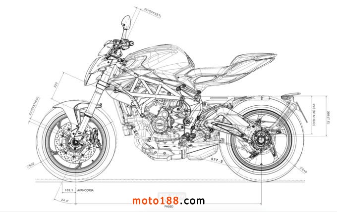 由此圖可以發(fā)現(xiàn),MV AGUSTA工程師為了求得更好的過彎穩(wěn)定性,將前叉頃角略為加大。為了彌補加大頃角后來帶來的神經(jīng)質(zhì),于是降低車輛軸線及更動后搖臂角度,讓軸距也由前代的1380mm增加至1400mm,造就穩(wěn)定度及靈活性兼具的操控性格。