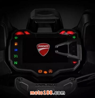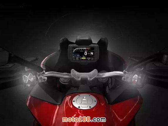 MTS 1200 S版車型裝備的5英寸全彩色液晶儀表有多種顯示模式,依照不同的騎行模式而不同,也可以由騎手自行選擇顯示模式。同時,顯示屏亮度也可以隨環(huán)境變化而自動調(diào)節(jié)。顯示模式共分四種:“運動”和“旅行”模式下,信息顯示得最全,“運動”模式下,發(fā)動機轉(zhuǎn)速顯示和Panigale上的一樣。在“城市”模式下,只顯示關(guān)鍵信息,以避免分散騎手的注意力。在“拉力”模式下,則增加了發(fā)動機轉(zhuǎn)速顯示。