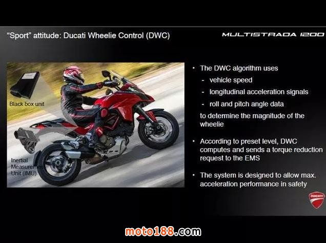 抬頭控制系統(tǒng)(DWC)會探測車輪轉(zhuǎn)速、傾角、俯仰角、加速度等數(shù)據(jù),在避免抬頭的前提下,輸出最大的動力。DWC對動力輸出的限制共分為8級,會在儀表盤上通過DTC燈的點亮告訴騎手。
