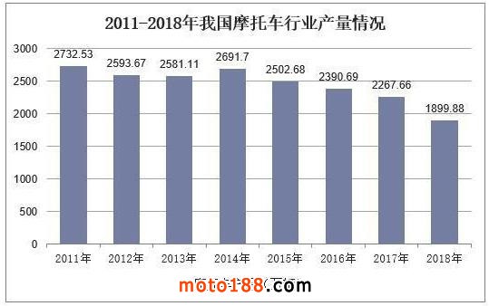 中國摩托車市場,受到城市禁限摩政策和國Ⅳ排放標(biāo)準(zhǔn)的實施以及汽車產(chǎn)業(yè)快速發(fā)展的替代等影響,摩托車產(chǎn)量及需求量均逐年下降。2012年以來,中國摩托車產(chǎn)業(yè)發(fā)展面臨國內(nèi)和國際諸多不利因素的影響,國內(nèi)市場下行態(tài)勢難以扭轉(zhuǎn),彎梁和騎式車下降幅度較大,摩托車年產(chǎn)量從2011年的2732.53萬輛下滑至2018年的1899.88萬輛,同比減少了832.65萬輛。