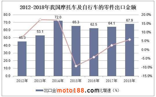 2012年國內(nèi)摩托車市場萎靡,摩托車出口也受到了匯率,印度崛起,出口國政治局勢不穩(wěn)等的持續(xù)影響,2012年我國摩托車出口數(shù)量同比下滑14.2%。近幾年來我國摩托車出口才開始出現(xiàn)較為穩(wěn)定的增長態(tài)勢,2018年我國摩托車出口數(shù)量2185萬輛,同比增長9.8%。2015-2018年我國摩托車及自行車的零件出口金額較為穩(wěn)定,維持在65億美元左右,2018年出口金額為67.9億美元,同比增長5.8%。