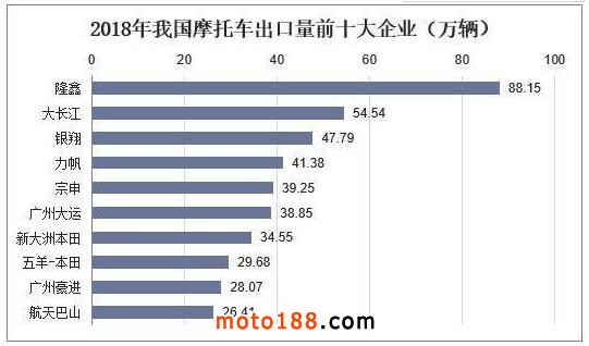 從出口企業(yè)來看,2018年我國摩托車生產(chǎn)企業(yè)出口量排名前10位的依次為:隆鑫、大長江、銀翔、力帆、宗申、廣州大運、新大洲本田、五羊-本田、廣州豪進和航天巴山,同比2017年,其中隆鑫和大長江出口量增速最快,2018年出口量分別排名第一、二名,出口量為88.15萬輛、54.54萬輛。