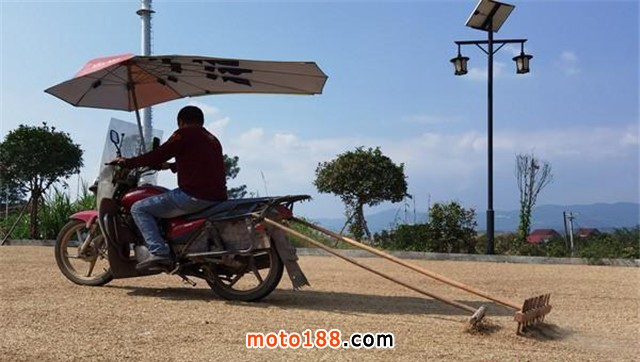 為搶住好天氣,曬谷時(shí),他想了個(gè)新招:將兩個(gè)翻谷耙綁在摩托車上,駕著“坐騎”,不急不緩地在曬坪上翻谷。“以前,曬谷時(shí),要安排專人負(fù)責(zé),現(xiàn)在在送谷的間隙,就能翻一次,不必安排專人,而且翻曬更加均勻,工作效率至少提高3倍以上,人也輕松。”林平說(shuō)。