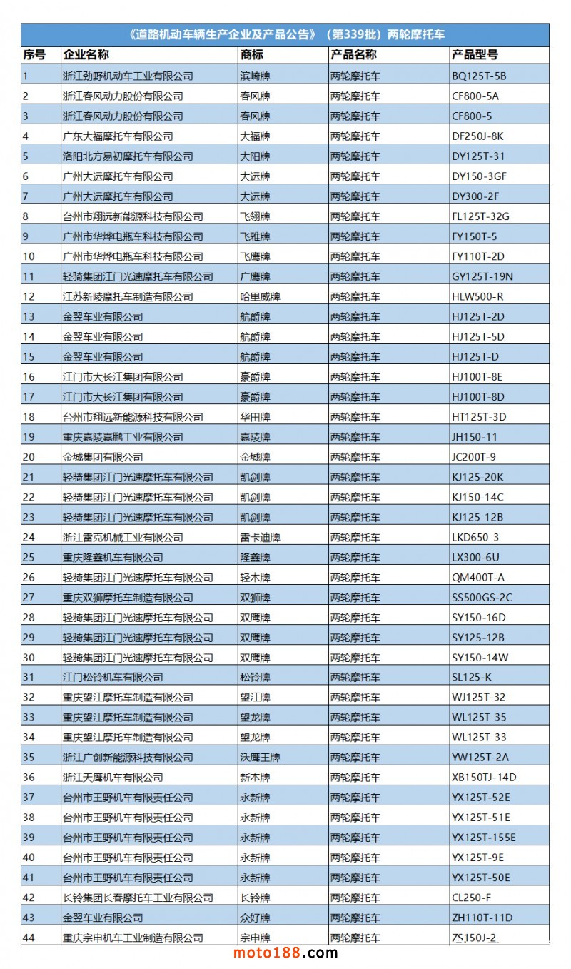 第339批公示兩輪摩托車品牌包括:濱崎牌春風(fēng)牌、大福牌、大陽牌、大運(yùn)牌、飛翎牌、飛雅牌、飛鷹牌、廣鷹牌、哈里威牌、航爵牌、豪爵牌、華田牌、嘉陵牌、金城牌、凱劍牌、雷卡迪牌、隆鑫牌、輕木牌、雙獅牌、雙鷹牌、松鈴牌、望江牌、望龍牌、沃鷹王牌、新本牌、永新牌、長鈴牌、眾好牌、宗申牌,能上牌的44款產(chǎn)品型號見圖1。