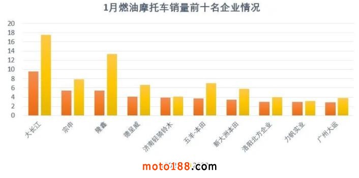 1月,燃油摩托車銷量前十名企業(yè)(集團(tuán))為大長(zhǎng)江、宗申、隆鑫、重慶德呈威、輕騎鈴木、五羊-本田、新大洲本田、洛陽北方、廣州大運(yùn)、力帆,分別銷售9.6萬輛、5.44萬輛、5.38萬輛、4.09萬輛、3.92萬輛、3.7萬輛、3.4萬輛、3.01萬輛、3萬輛和2.84萬輛。