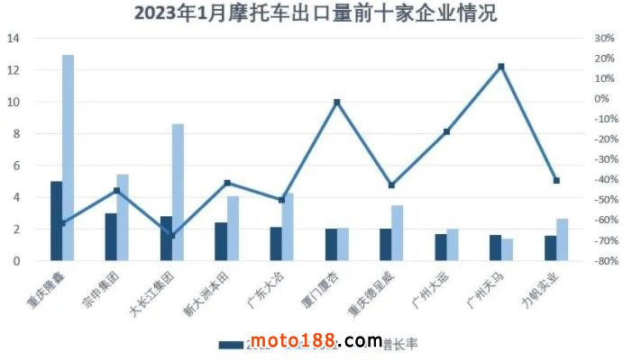 1月,摩托車出口量排名前十位的企業(yè)依次為:隆鑫、宗申、大長(zhǎng)江、新大洲本田、大冶、廈杏、重慶德呈威、大運(yùn)、廣州天馬、力帆,上述十家企業(yè)共出口24.34萬輛,占摩托車出口總量的56.12%。