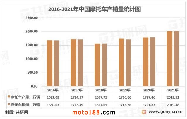 中國摩托車歷經(jīng)多年發(fā)展,已成為產(chǎn)業(yè)鏈齊全,市場化程度最高的產(chǎn)業(yè)之一。2021年中國摩托車產(chǎn)銷量達到2015年以來最高值,產(chǎn)銷量分別為2019.52萬輛和2019.48萬輛。