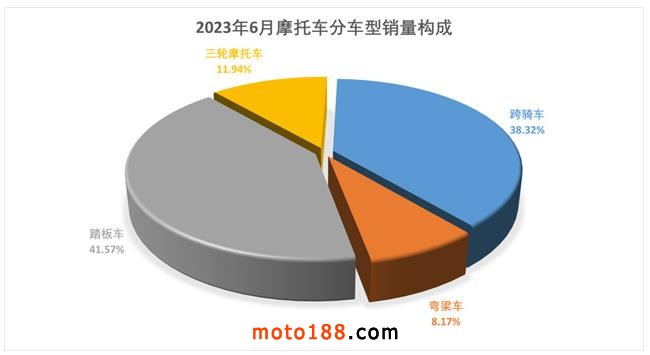 1-6月,跨騎車產(chǎn)銷366.18萬輛和369.64萬輛,同比下降4.67%和5.39%;踏板車產(chǎn)銷435.78萬輛和401萬輛,產(chǎn)銷量同比下降9.32%和18.78%;彎梁車產(chǎn)銷79.02萬輛和78.8萬輛,同比增長2.53%和1.66%。從各車型銷量占二輪車總銷量的比重看,跨騎、踏板和彎梁三類車型占比分別為43.51%、47.21%和9.28%。