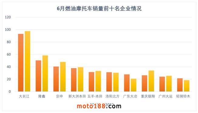 1-6月,燃油摩托車銷量前十名企業(yè)(集團)為大長江、隆鑫、宗申、新大洲本田、五羊-本田、洛陽北方、廣東大冶、重慶銀翔、廣州大運、輕騎鈴木,分別銷售93.03萬輛、50.3萬輛、40.43萬輛、37.84萬輛、31.56萬輛、31.22萬輛、27.83萬輛、26.36萬輛、24.07萬輛和21.44萬輛。